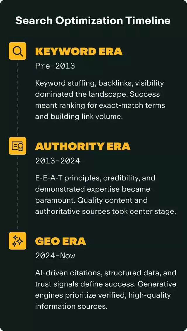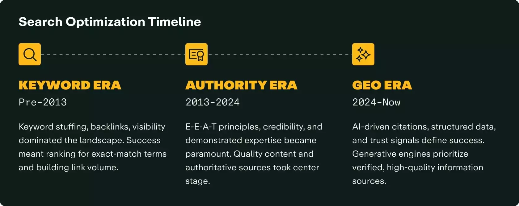 Now we have entered what can be called the GEO Era — Generative Engine Optimization. Search is no longer only about listing websites; it is about feeding answers to AI-driven models that synthesize, summarize, and cite information. GEO means optimizing content so that generative engines like Google SGE, ChatGPT, and Perplexity view it as a reliable source (Search Engine Land, 2024; A16z, 2025).