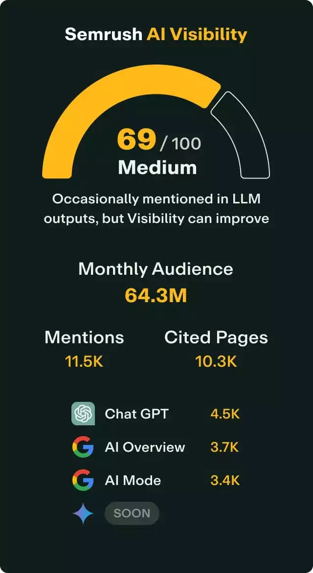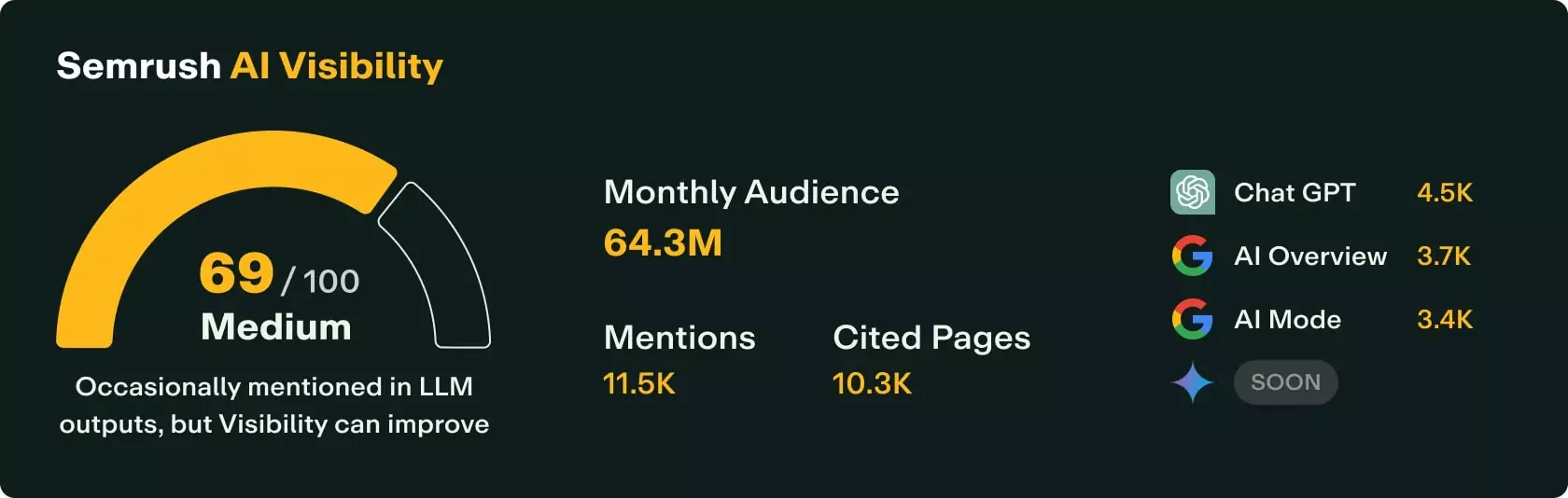 | Semrush | Expanding from classic SEO into AI visibility tracking, SEMrush now monitors how domains appear in Google’s AI Overviews, featured snippets, and generative search results. It combines these insights with keyword, backlink, and entity data to give a unified view of both SEO and GEO performance. |